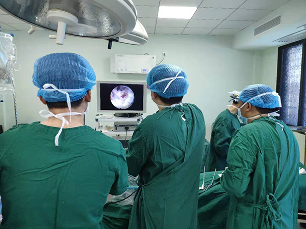 10月底,岳陽愛康醫(yī)院骨科主任劉鴻程為該患者進(jìn)行經(jīng)皮椎間孔鏡髓核摘除術(shù)。在局麻下利用穿刺針,經(jīng)病變椎體后外側(cè)穿刺至椎間孔處,在擴(kuò)大椎間孔及神經(jīng)根管后,建立了手術(shù)微創(chuàng)通道,并通過該單一通道對(duì)其突出的腰椎間盤實(shí)施了切除。
