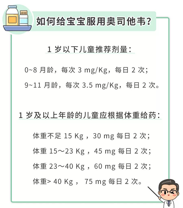 (1)奧司他韋(奧司他韋僅作為緊急臨時(shí)預(yù)防措施,適用于沒有接種疫苗,或接種疫苗后尚未獲得免疫力的重癥流感高危人群。48小時(shí)內(nèi)使用,效果最佳!如果錯(cuò)過了,5天內(nèi)服用也有一定效果。不同月齡、不同體重的寶寶,服用的劑量有所差異。