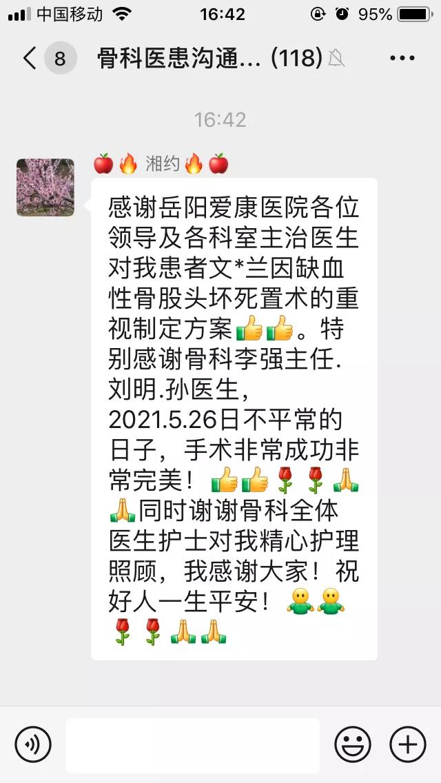 “手術(shù)非常成功非常完美!感謝骨科全體醫(yī)生、護(hù)士,你們就像我的家人一樣待我好,我來愛康真是來對地方了!不但實(shí)現(xiàn)了我甩掉雙拐的愿望,讓我終于可以“挺直腰桿”了!還讓我感受到與其他醫(yī)院的不同,原來在醫(yī)院也可以享受親人般的關(guān)懷,很溫暖.......”文娭毑發(fā)自內(nèi)心的說道,手術(shù)完成的當(dāng)晚文娭毑便在骨科醫(yī)患溝通群內(nèi)發(fā)出感謝的話語。
