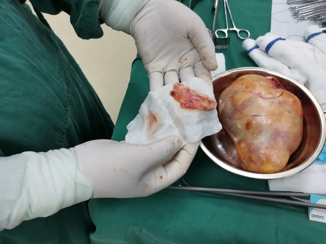有了周詳?shù)挠?jì)劃,經(jīng)過充分的術(shù)前準(zhǔn)備,手術(shù)順利開展了,考慮腹腔腫塊較大,醫(yī)生選擇在下腹部開一小切口,取出腫塊。經(jīng)過醫(yī)生與麻醉師一個(gè)多小時(shí)的努力奮戰(zhàn),終于成功摘除了楊?yuàn)謿驳亩〞r(shí)“炸彈”,手術(shù)順利完成,觀察楊?yuàn)謿采w征平穩(wěn)后,手術(shù)室緊張的氣氛頓時(shí)緩解了,醫(yī)生與麻醉師同時(shí)露出滿意的笑容。