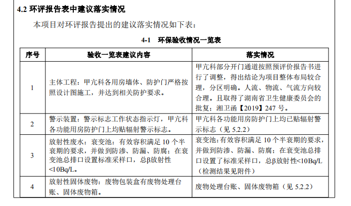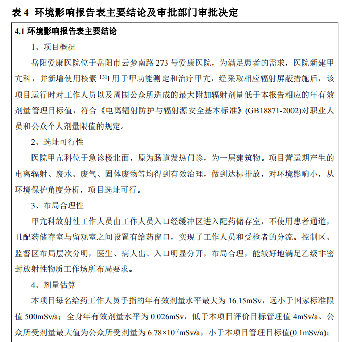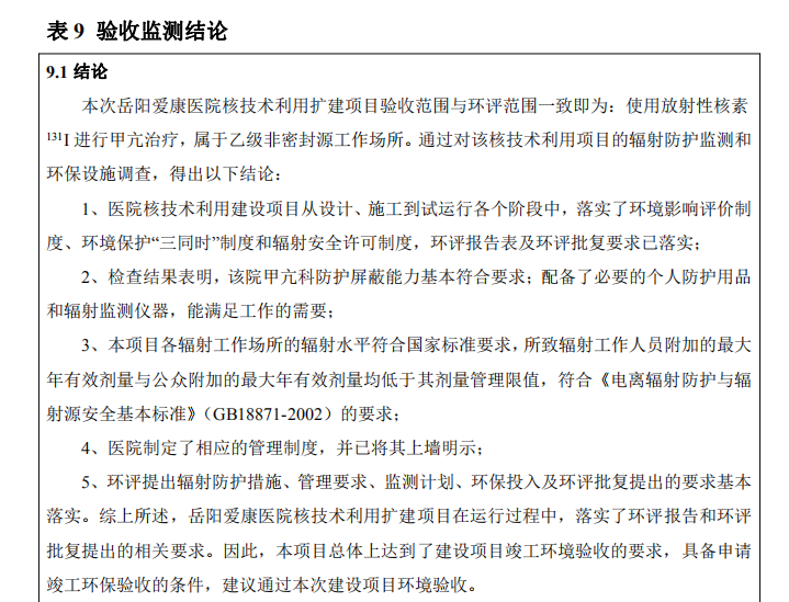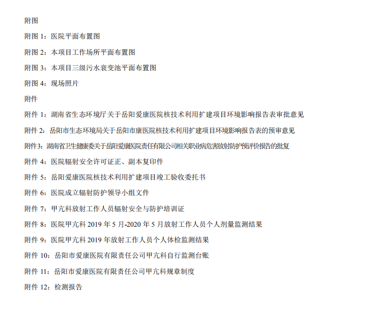 2020 年 11 ? 11 ?,岳陽市愛康醫(yī)院有限責(zé)任公司根據(jù)《建設(shè)項(xiàng)?竣?環(huán)境保護(hù)驗(yàn)收暫?辦法》、環(huán)境影響評價(jià)報(bào)告表及批復(fù)?件等要求,組織有關(guān)專家和單位召開驗(yàn)收會(huì)議(驗(yàn)收組名單?簽到表),對核技術(shù)利?擴(kuò)建項(xiàng)?(已建?個(gè)?級?密封放射性?作場所,利? 131I 開展甲亢治療)進(jìn)?竣?環(huán)境保護(hù)驗(yàn)收,驗(yàn)收組部分成員進(jìn)?了現(xiàn)場踏勘、查閱了資料,形成如下意見: