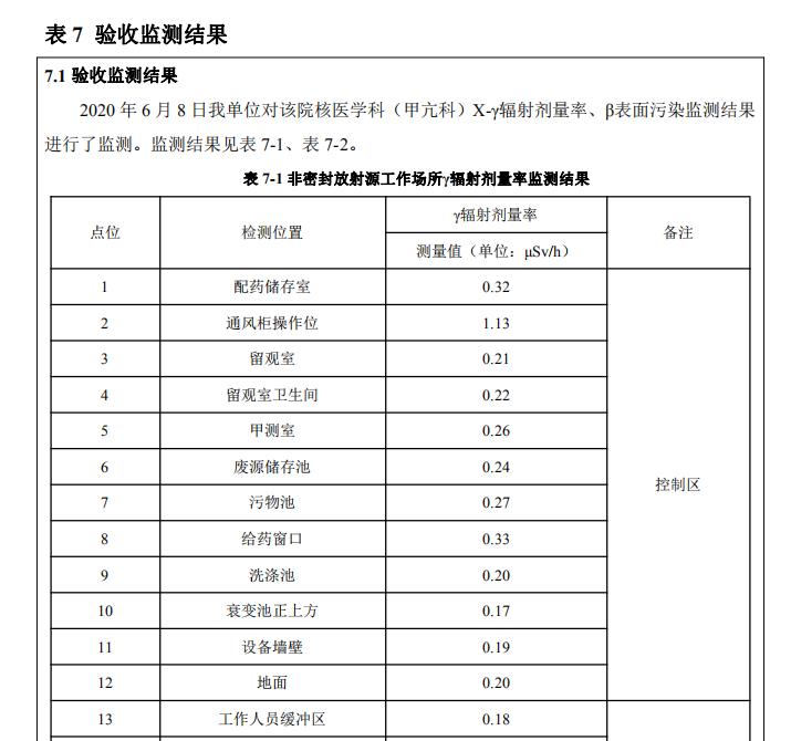 根據(jù)湖南凱星環(huán)??萍加邢薰緦υ狸枑劭滇t(yī)院核技術(shù)利?擴(kuò)建項(xiàng)?現(xiàn)場驗(yàn)收監(jiān)測報(bào)告數(shù)據(jù)顯示:各監(jiān)測點(diǎn)位γ輻射劑量率、放射性β表?沾污、廢?總β,均滿?環(huán)評報(bào)告表中的有關(guān)要求。