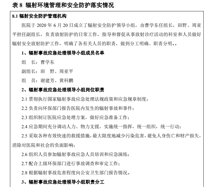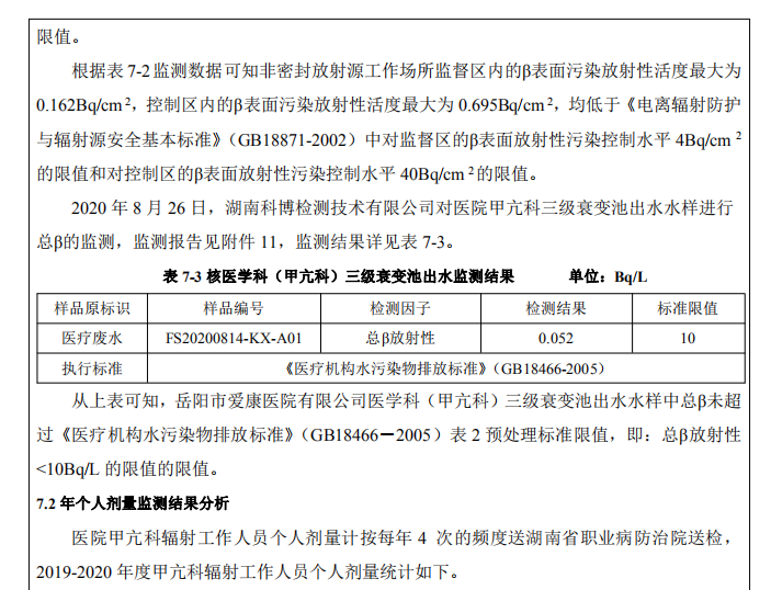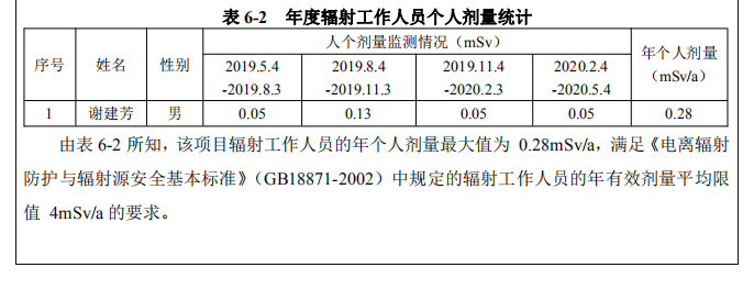 根據(jù)湖南省職業(yè)病防治院出具的 2019 年-2020 年年度的岳陽市愛康醫(yī)院有限責(zé)任公司個(gè)?劑量監(jiān)測報(bào)告顯示:輻射?作?員的個(gè)?劑量均滿?環(huán)評報(bào)告中的有關(guān)要求。